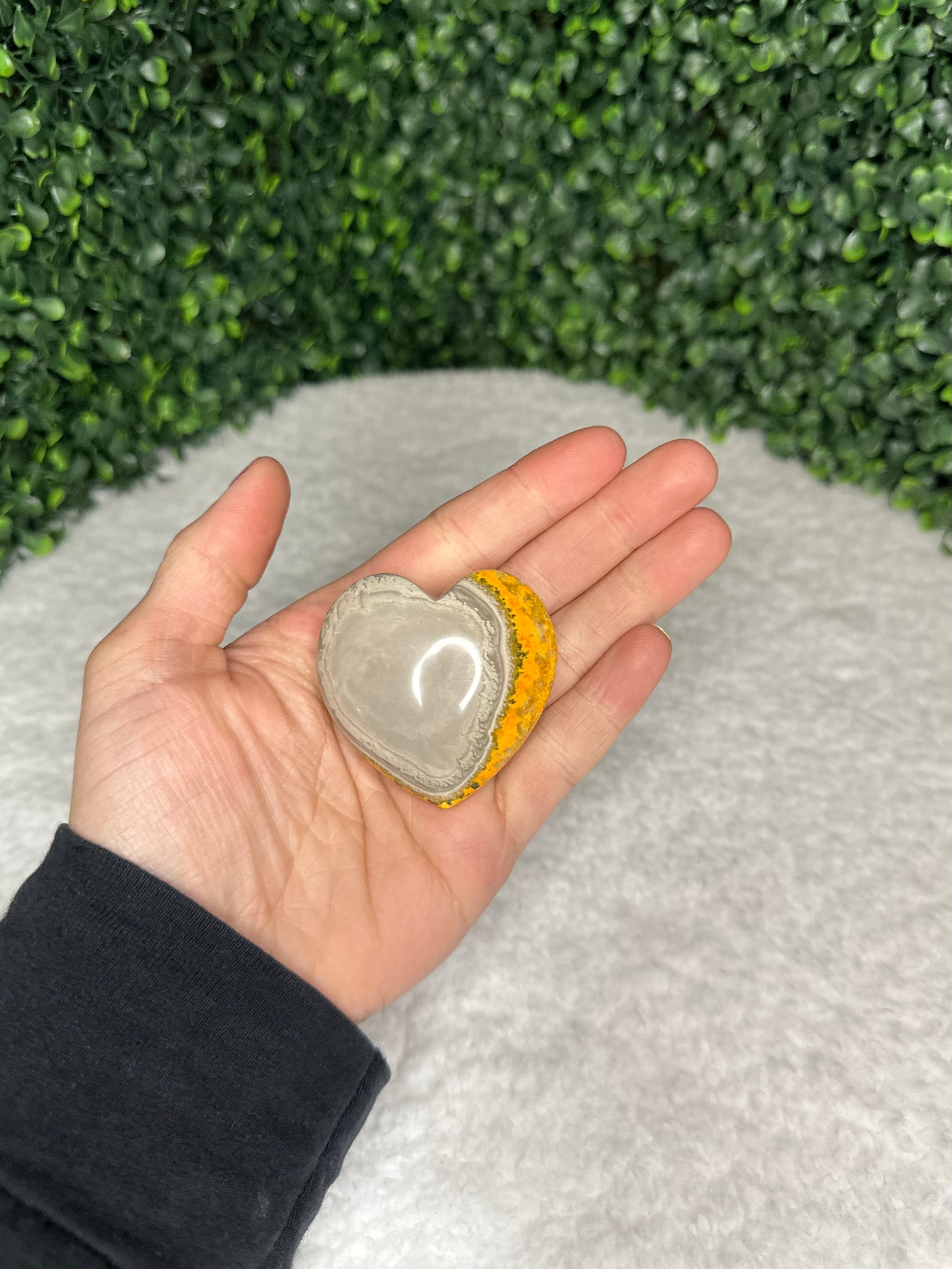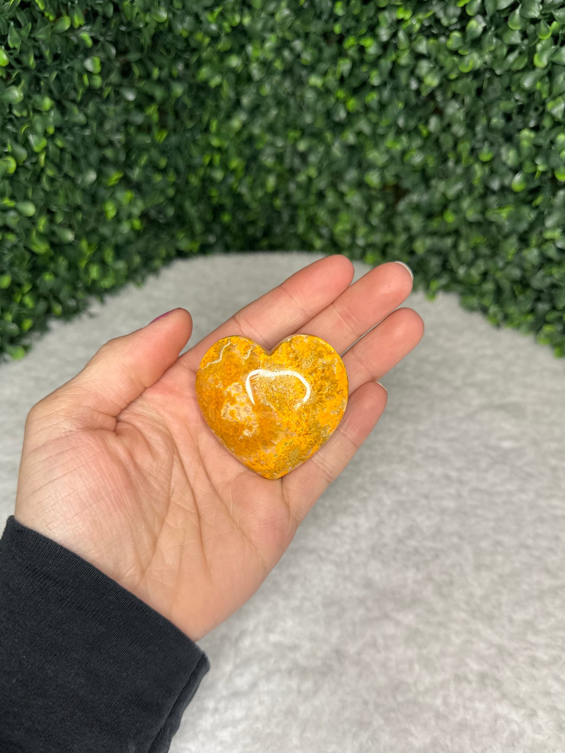 Bumble Bee Jasper receives its brilliant coloring from arsenic and sulfur. This beautifully carved heart will help to spark joy and creativity in its user. It is also highly recognized for its ability to bring momentum to spiritual growth. Keep in your pocket throughout the day to keep yourself energized and confident!
