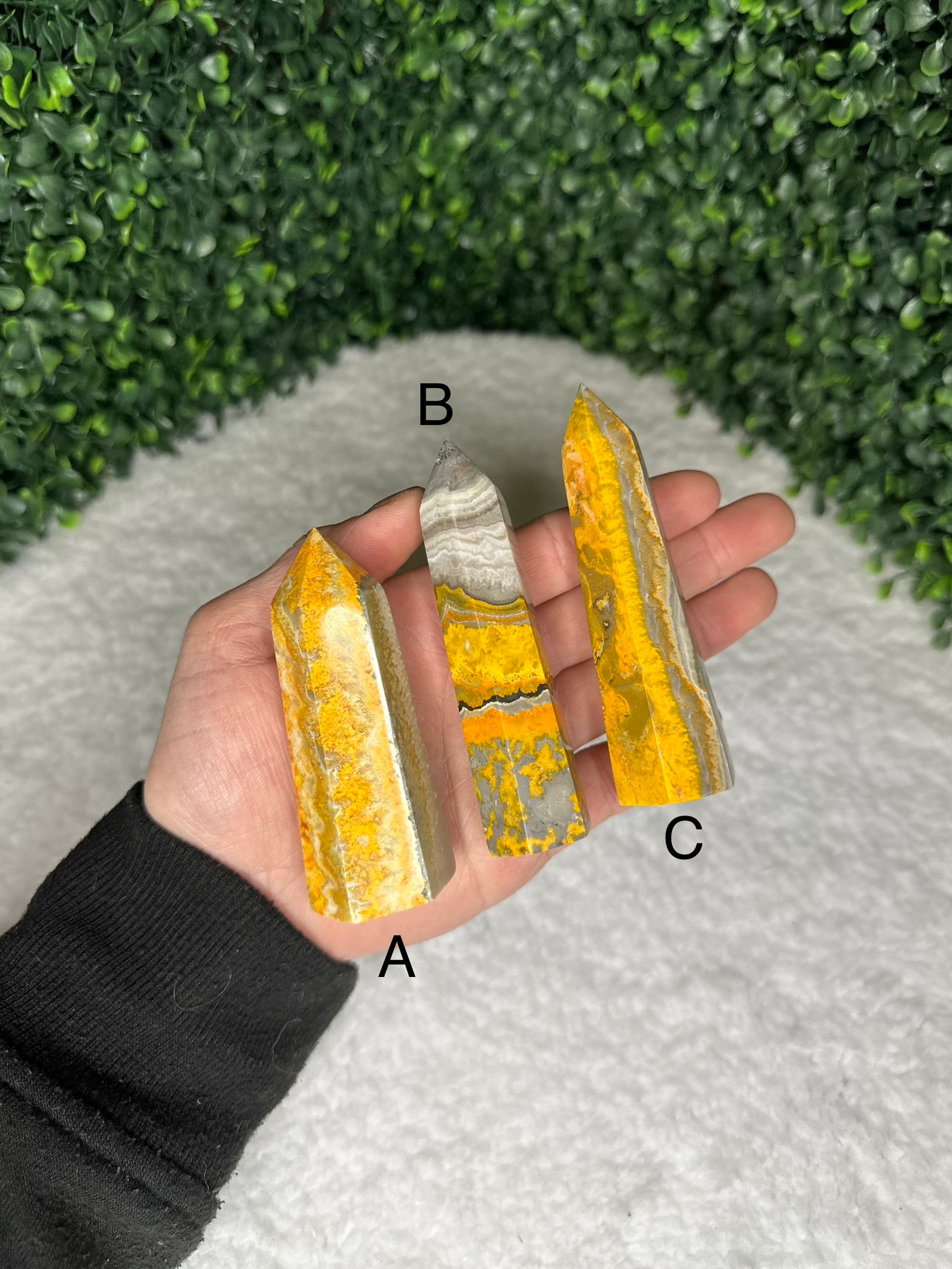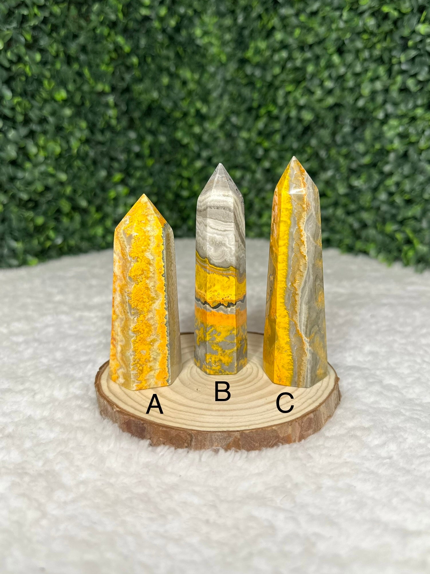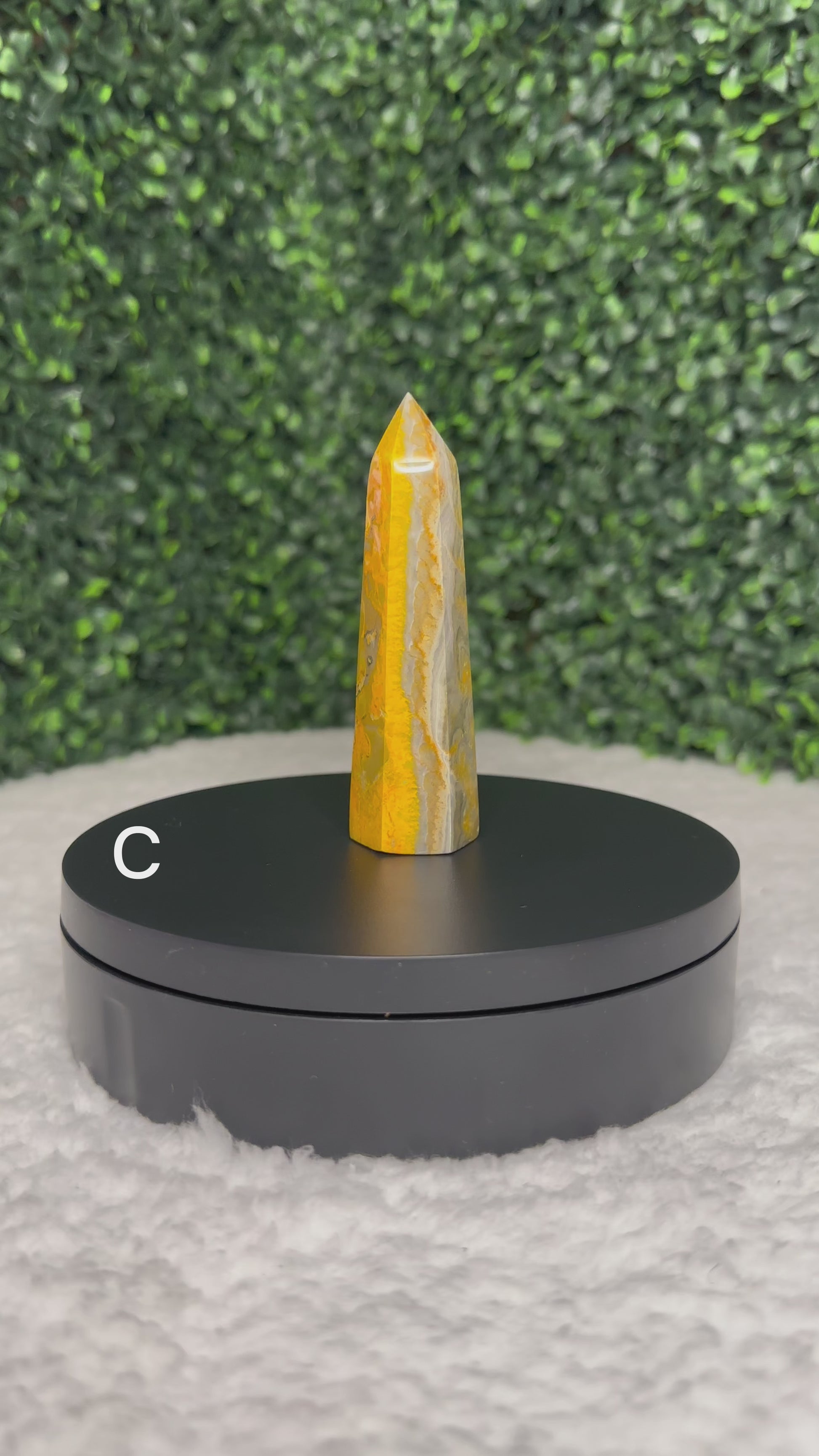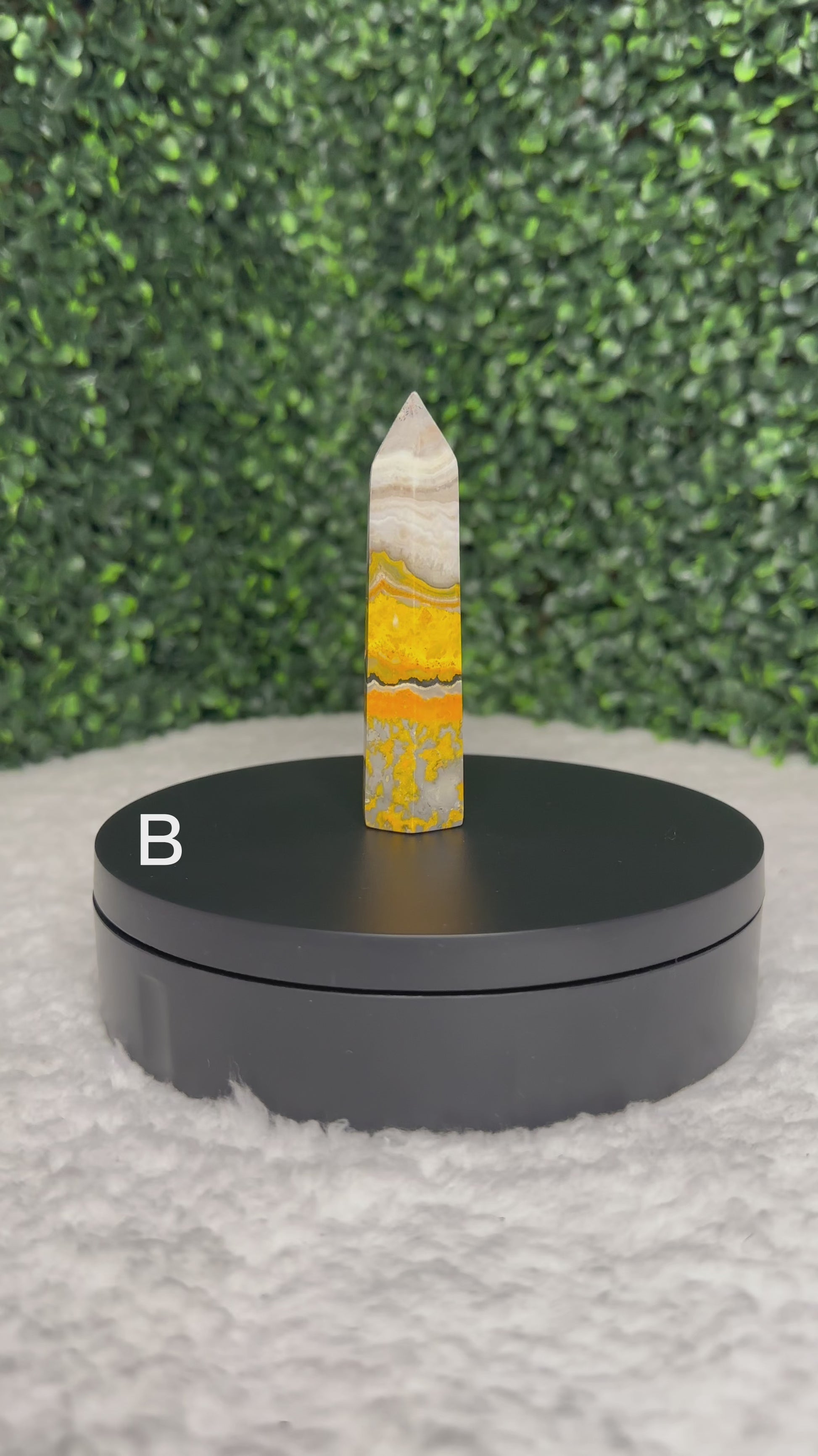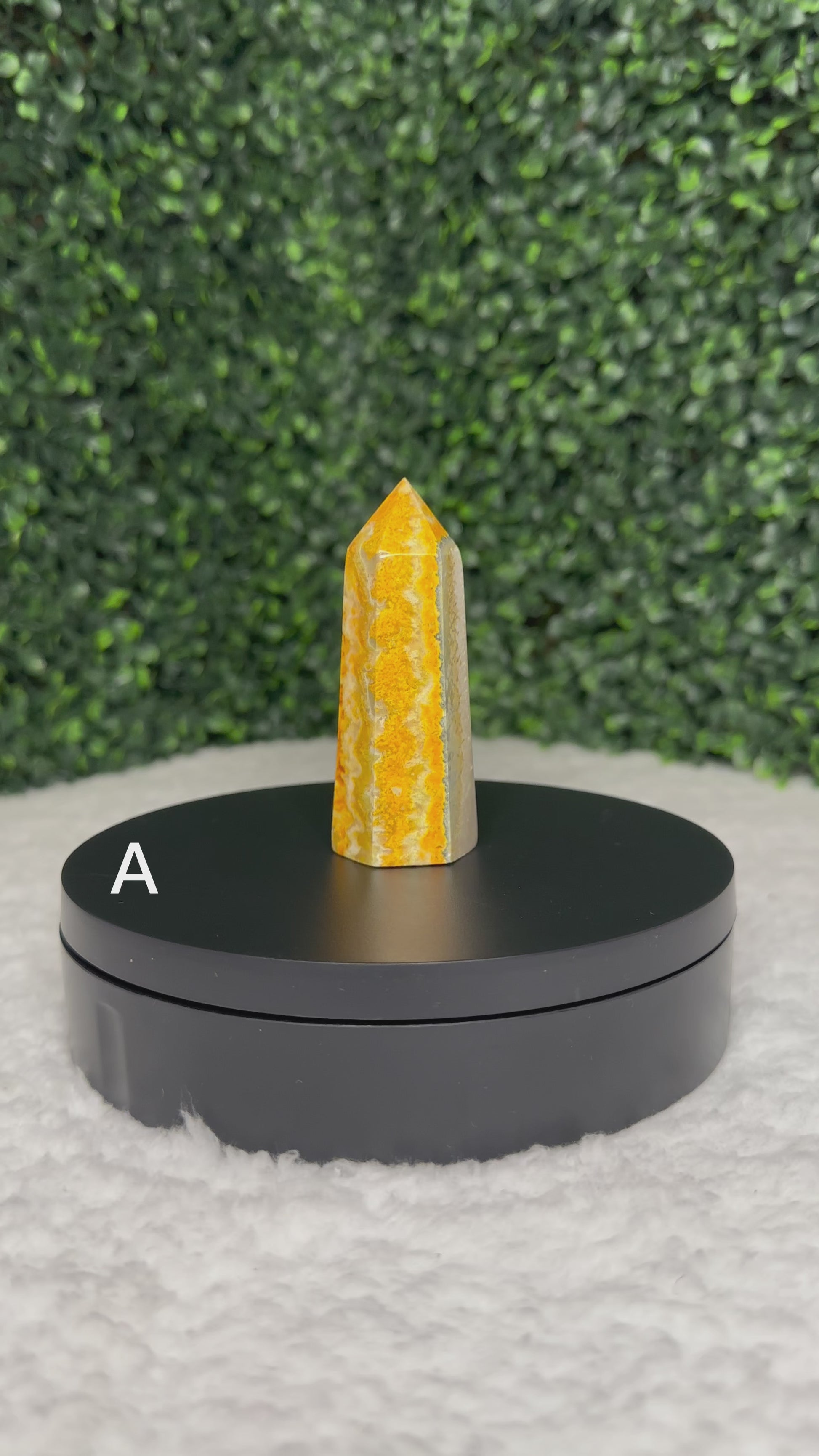 Bumble Bee Jasper receives its brilliant coloring from arsenic and sulfur. This beautifully carved tower will help to spark joy and creativity in its user. It is also highly recognized for its ability to bring momentum to spiritual growth. Keep in your sacred spaces to bring a very uplifting and confident energy.