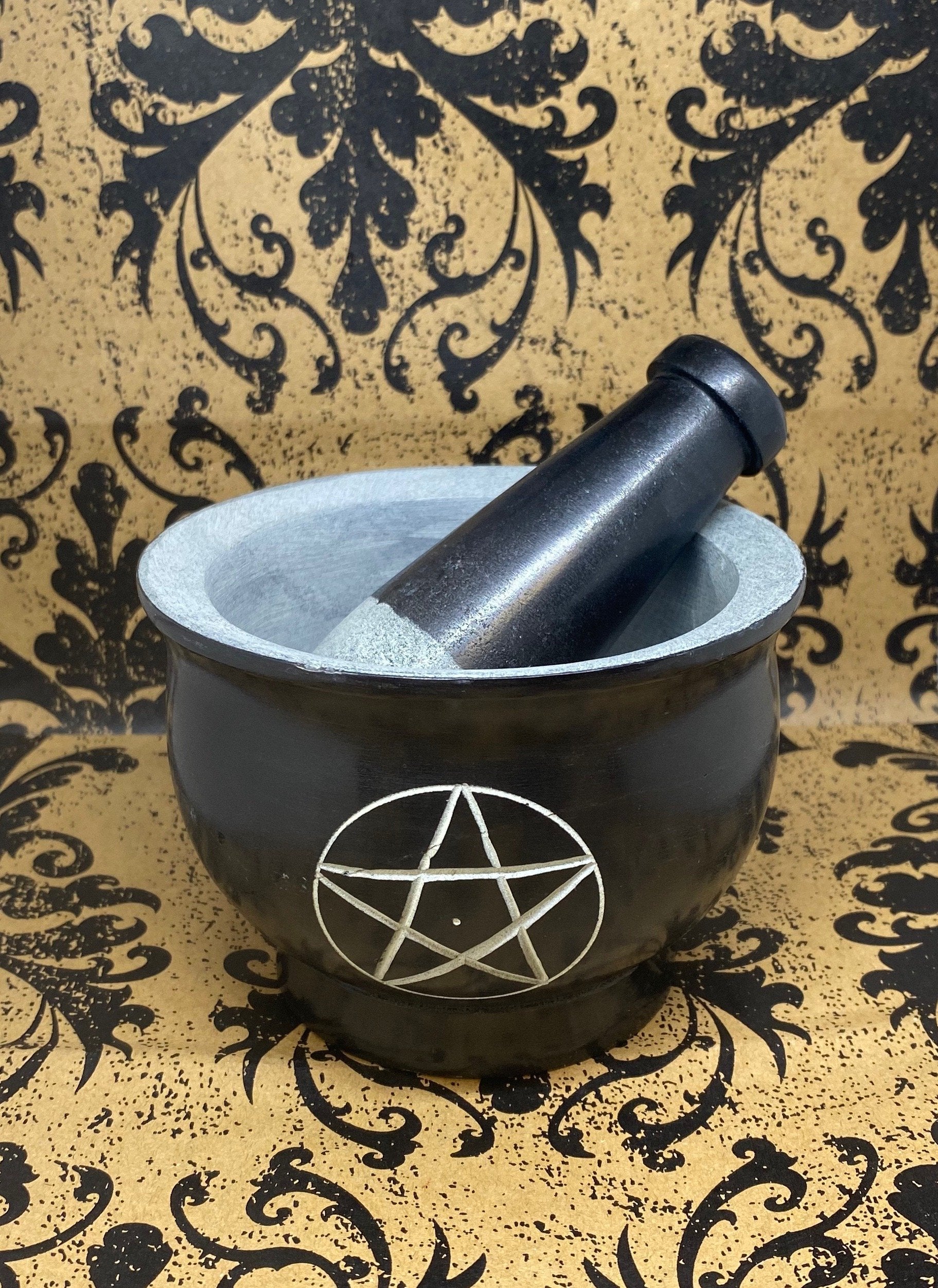 A black soapstone mortar & pestle set with pentacles carved into the side of the mortar.
